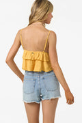 Soak up some sunshine in this light and flowy tank top. It features a tiered hem design, crop length fit and solid color wash.